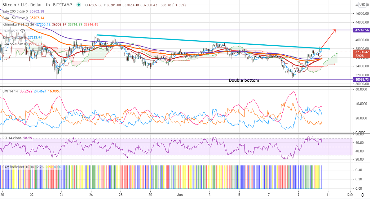 BTCUSD continues to trade higher for the second consecutive days and surged more than 20%. The positive news from El Salvador is supporting the price at lower levels. The country has said that it wouldn't impose the capital gains tax on Bitcoin earnings. The pair has formed a double bottom around $31000, any weakness only if closes below that level. It hits an intraday high of $38450 and is currently trading around $36362.