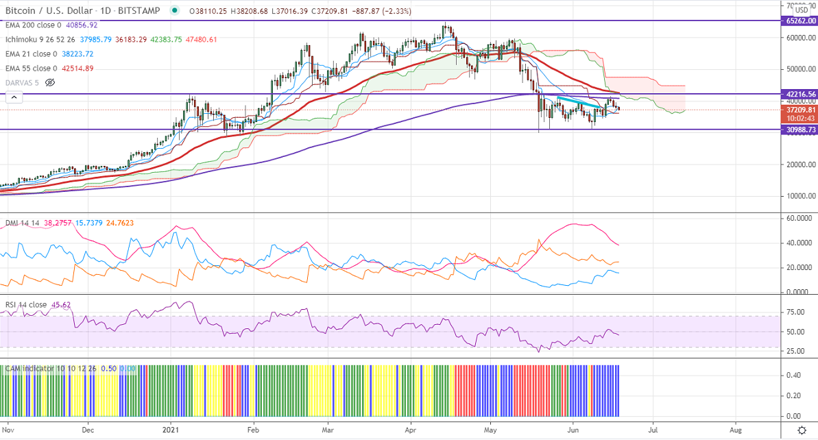 The pair's minor support is around $36000. Any convincing break below will drag the pair down to $34800/$32550/$30000. Any close below $30000 will drag the pair down to $26800/$20000.