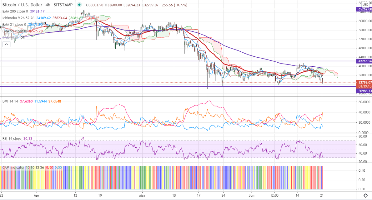 BTCUSD continues to trade lower and lost more than 20% in the past two days on china's mining crackdown. The Chinese authorities have asked to close cryptocurrency mining projects in the southwest province of Sichuan. The short-term trend is still bearish as long as resistance $43000 holds. It hits an intraday low of $32094 and is currently trading around $32921.