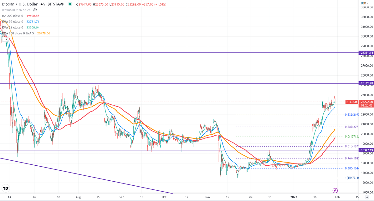 BTCUSD traded higher for the third consecutive week and jumped more than $6500 on upbeat market sentiment. US PCE gauge for inflation came at 4.4% YoY, compared to a forecast of 4.7%. Markets expect Fed to halt the 50 bpbs rate hike in the fed policy meeting this week. It hits a high of $23796 and is currently trading around $23192
