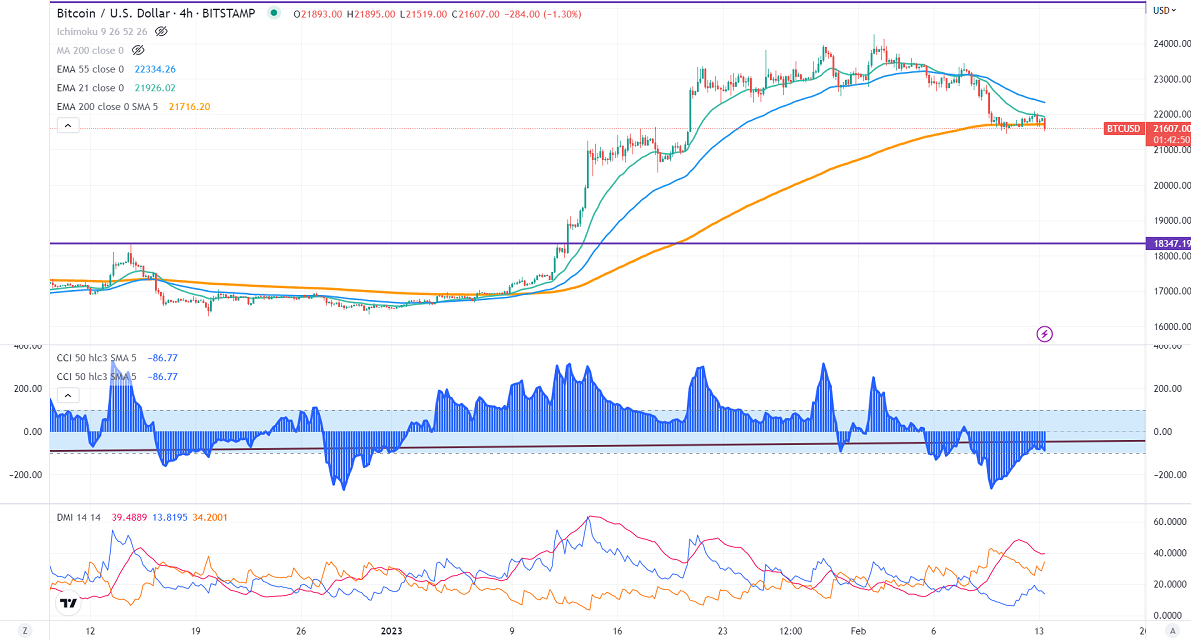 BTCUSD is trading lower for a second consecutive week on upbeat US jobs data. Hawkish comments from Fed members have increased the chance of further rate hikes by the Fed. It hits a low of $21467 and is currently trading around $21679.