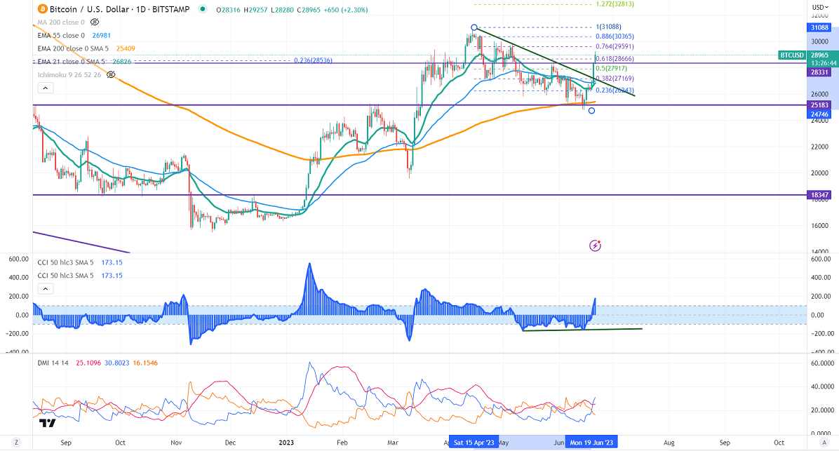 BTCUSD regained its positive momentum and surged above $4000 on upbeat market sentiment. The institutional investor's sentiment was boosted after Black Rock and Invesco applied for spot Bitcoin ETF. BTC hits an intraday low of $29014 and currently trading around $28966.