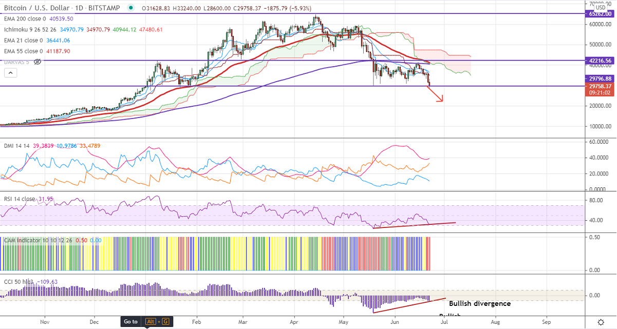 BTCUSD breaks major support $30000 low made on May 19th, 2021 despite micro strategy acquired additional 13005 Bitcoin. The People's Bank of China (PBOC) said that banks must block crypto transactions. The pair has lost more than 15% after a minor pullback to $33240.The short-term trend is still bearish as long as resistance $43000 holds. It hits an intraday low of $28600 and is currently trading around $29050.