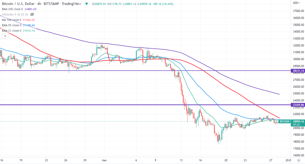 BTCUSD holds above $20000 on upbeat market sentiment. The weak US economic data and surging inflation could dampen aggressive rate hikes by Fed. It hits a high of $21178 at the time of writing and currently trading around $21046.