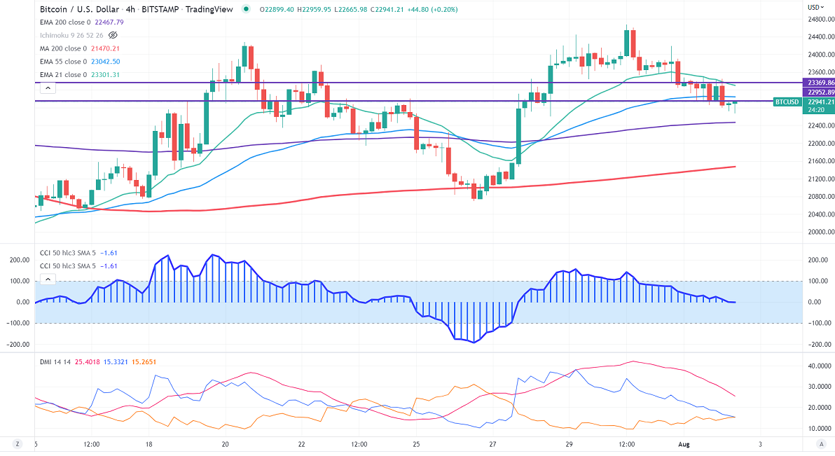 BTCUSD trades slightly lower despite upbeat market sentiment. The pair rebounded sharply after the dovish 75 bpbs rate hike by Fed.US dollar index continues to trade weak for a third consecutive week and dropped below 105.50. Bitcoin got exhausted after hitting a high of $24676 and is currently trading around $22910.