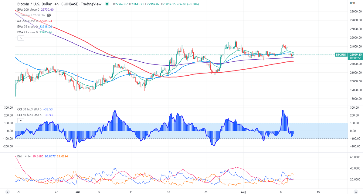 BTCUSD lost most of its gains made the previous week on subdued market sentiment Markets eye US CPI data for further direction. The minor weakness in the US equity market also puts pressure on BTC at higher levels. It hits an intraday high of $22669 and is currently trading around $23054.