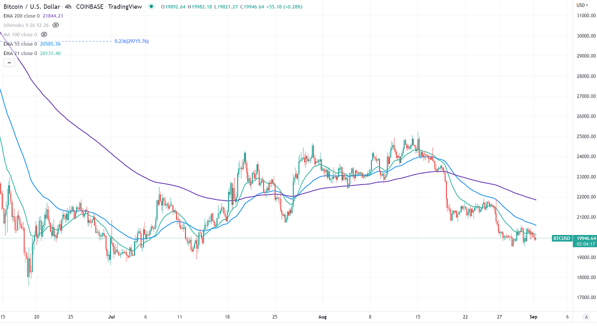 BTCUSD is trading weak for a second consecutive week on the hawkish Fed Chairman speech. The demand for riskier assets like Bitcoin and stocks decreased on hopes of a 75 bpbs rate hike by the ECB in the next monetary policy meeting. The surging US treasury yields also put pressure on BTC at higher levels.BTC hits a low of $19526 and currently trading around $19916.