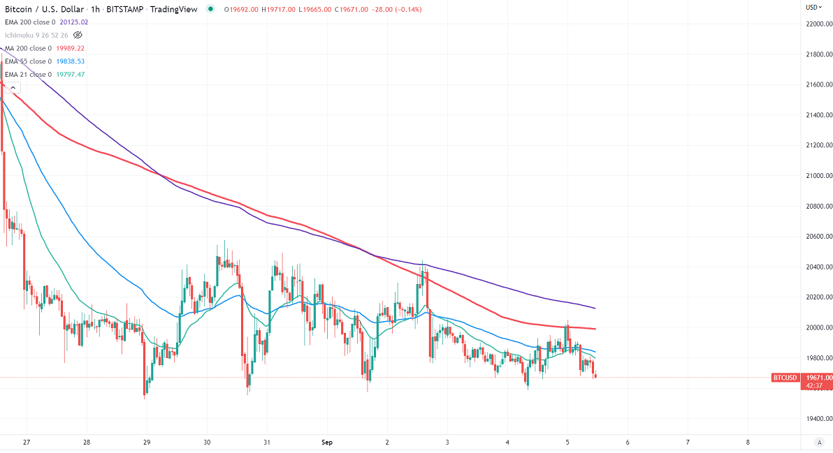 BTCUSD pared some of its gains after upbeat US jobs data. US economy has added 315000 jobs in Aug compared to a forecast of 295K. The rate of unemployment rose to 3.7% vs an estimated 3.5%. Average hourly earnings came at 0.30% below the consensus of 0.40%. The minor sell-off in US treasury yields supports BTC at lower levels.BTC hits a low of $19526 and currently trading around $19916.