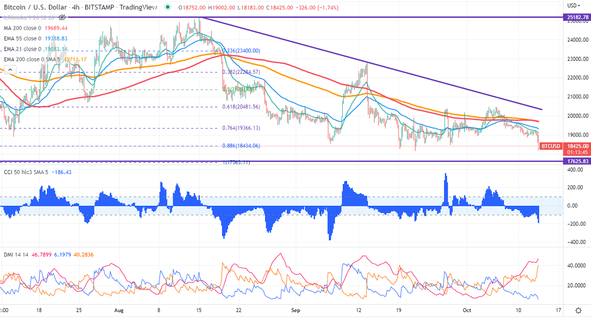 BTCUSD pared most of its gains after upbeat US CPI data. The inflation rose 0.40% in Sep MoM and yearly CPI rose to 8.2% vs an estimate of 8.1%. BTC hits a low of $18183 at the time of writing and currently trading around $18416.