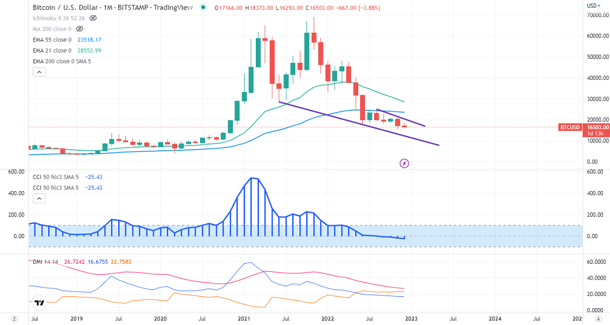 BTCUSD was one of the worst performers this year and lost more than $30000 as risk aversion increased. US Fed has increased 425 basis points this year to tackle inflation. Bitcoin hits a low of $15479 and currently trading around $16483.