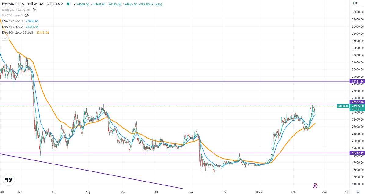 BTCUSD has been consolidating in a narrow range for the past four days. It gained momentum despite a strong PPI. It rose to 6% YoY, well above an estimated 5.6%. The inflation for the month of Jan increased by 0.70% monthly vs. an estimated 0.20%.Market eyes FOMC meeting minutes for further direction.BTC hits a high of $25270 and currently trading around $24868.
