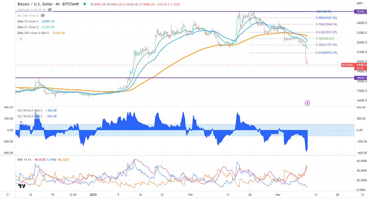 BTCUSD price witnessed a steeper correction on weak market sentiment. The chance of aggressive rate hikes by the Fed and ECB has decreased the demand for riskier assets like stocks, Crypto. Markets eye US Nonfarm payroll jobs data for further direction. The liquidation of $303 million worth of positions as fear of crash intensifies. BTC hits a low of $19569 and currently trading around $19655.