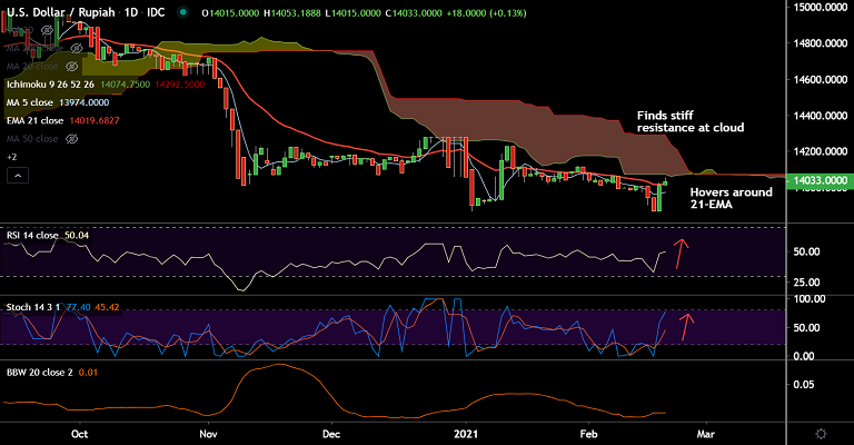 Price action hovers around 21-EMA. Technical bias is bullish, but the pair finds stiff resistance at daily cloud. Break above will see further gains.