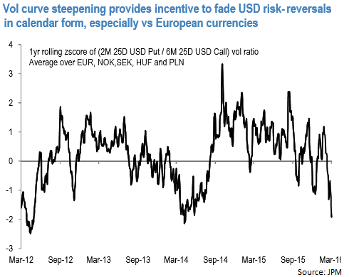 In order to boost the value in selling USD/SEK risk-reversals, we take advantage of the welcome steepening in the curve across European currencies and leg a short dated put with a longer dated short call position, making this a calendar risk reversal trade.