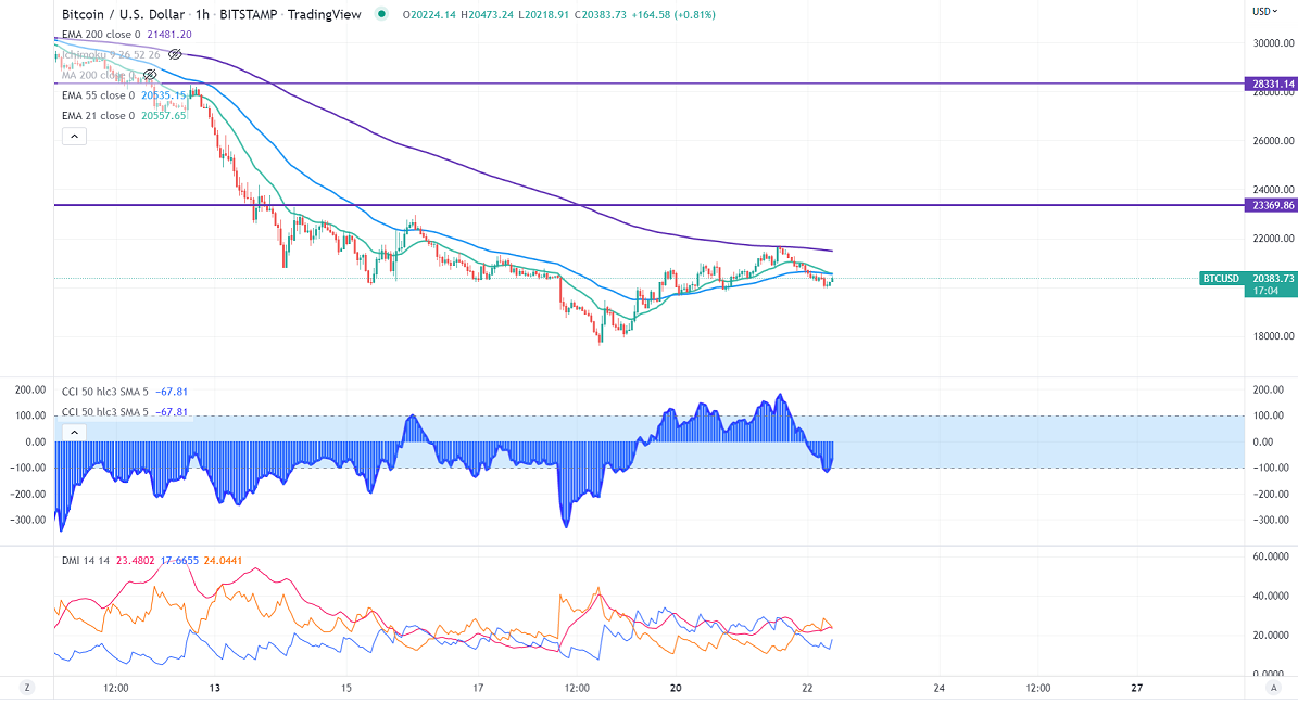 BTCUSD pared some of its gains made yesterday on risk aversion. Markets eye US Fed Chairman Powell's testimony today for further direction. Any hawkish comments will further drag the BTC down. The decline in crude oil prices is a positive factor as a reduction in inflation would prevent an aggressive rate hike. It hits a low of $19947 at the time of writing and currently trading around $20260.