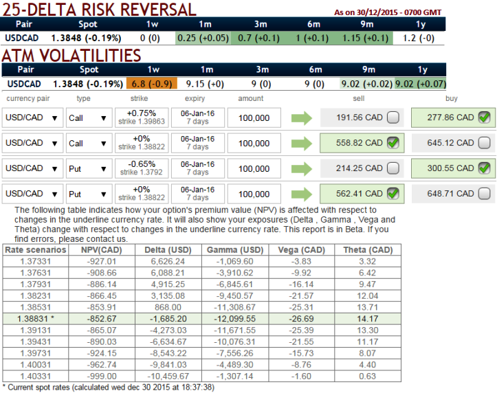 Long 1w (0.65%) OTM 0.30 gamma put (strike at around 1.3770) & Short 2D ATM Put + Short 2D ATM Call & Long 1w (0.75%) OTM 0.27 delta call (strike at around 1.3966).