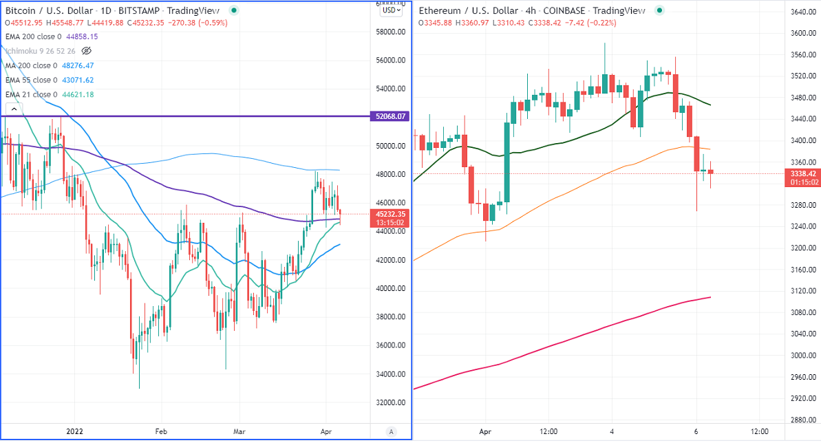 BTCUSD trades lower after hawkish comets from Fed members. Markets eye US Fed meeting minutes for further direction. Whale-sized purchases by Micro strategy and Luna foundation are bullish signals for Bitcoin. It hits an intraday low of $44418 and is currently trading around $45319.