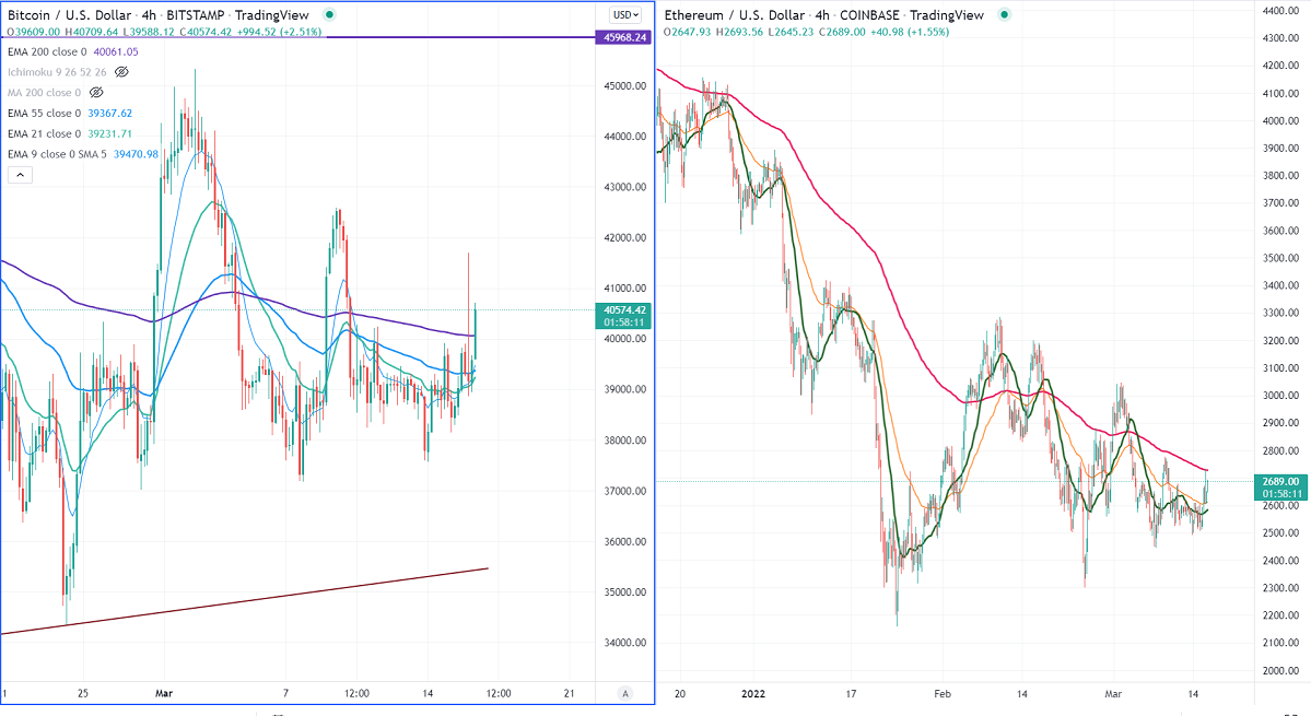 BTCUSD regained above $40000 on hopes for diplomacy between Russia and Ukraine. Markets eye US Fed monetary policy for further direction. It hits an intraday high of $40707 and is currently trading around $40432.