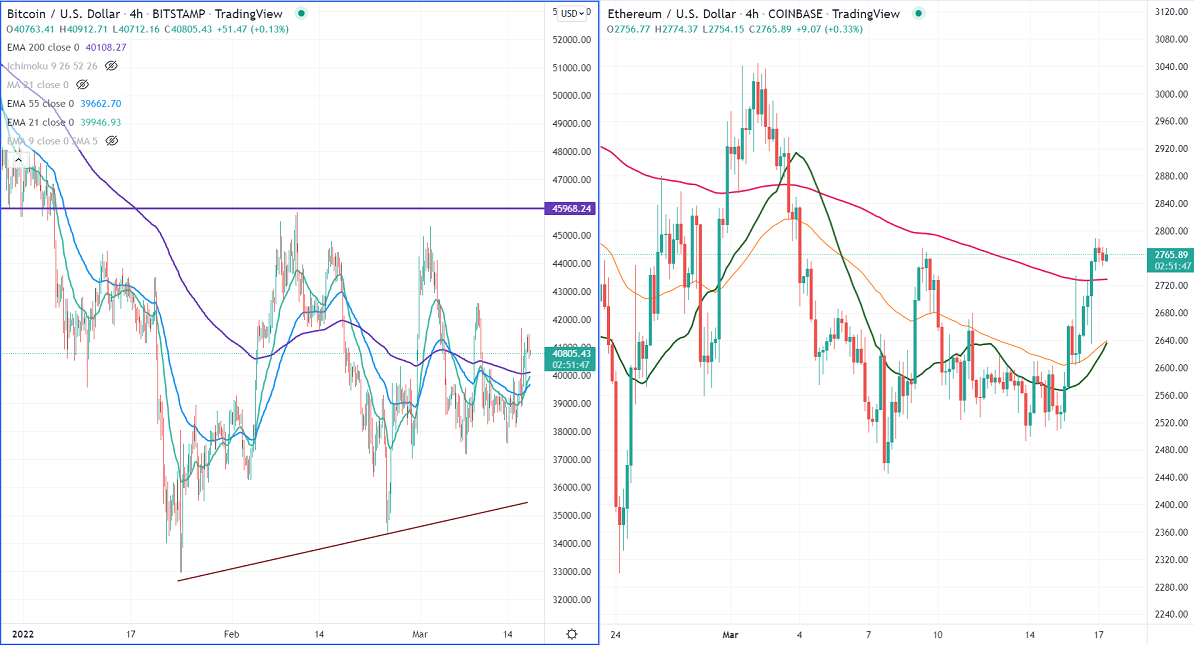 BTCUSD showed a positive momentum after Fed monetary policy. The Central bank hiked rates by 25 bpbs and Fed Participants expects seven hikes in 2022. It hits an intraday high of $41497 and is currently trading around $40875.