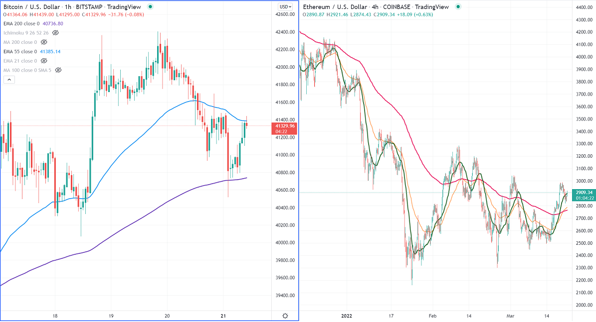BTCUSD consolidating in a narrow range of $42597 for the past 10 days. The escalation of conflict between Russia and Ukraine puts pressure on the pair at higher levels. It hits an intraday high of $41437 and is currently trading around $41309.