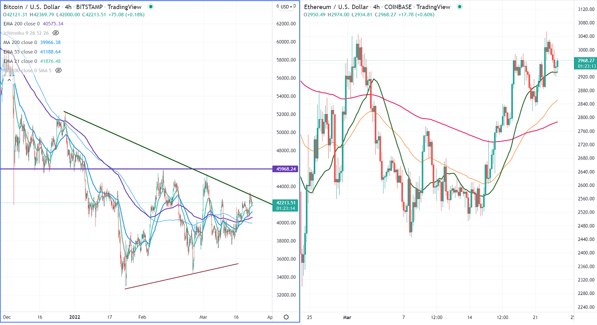 BTCUSD declined once again after a minor jump of about $43000 due to a lack of follow-through buying. The pair has halted its one week of an uptrend as demand for riskier assets due to Russia and Ukraine conflict. It hits an intraday high of $43337 and is currently trading around $42537.