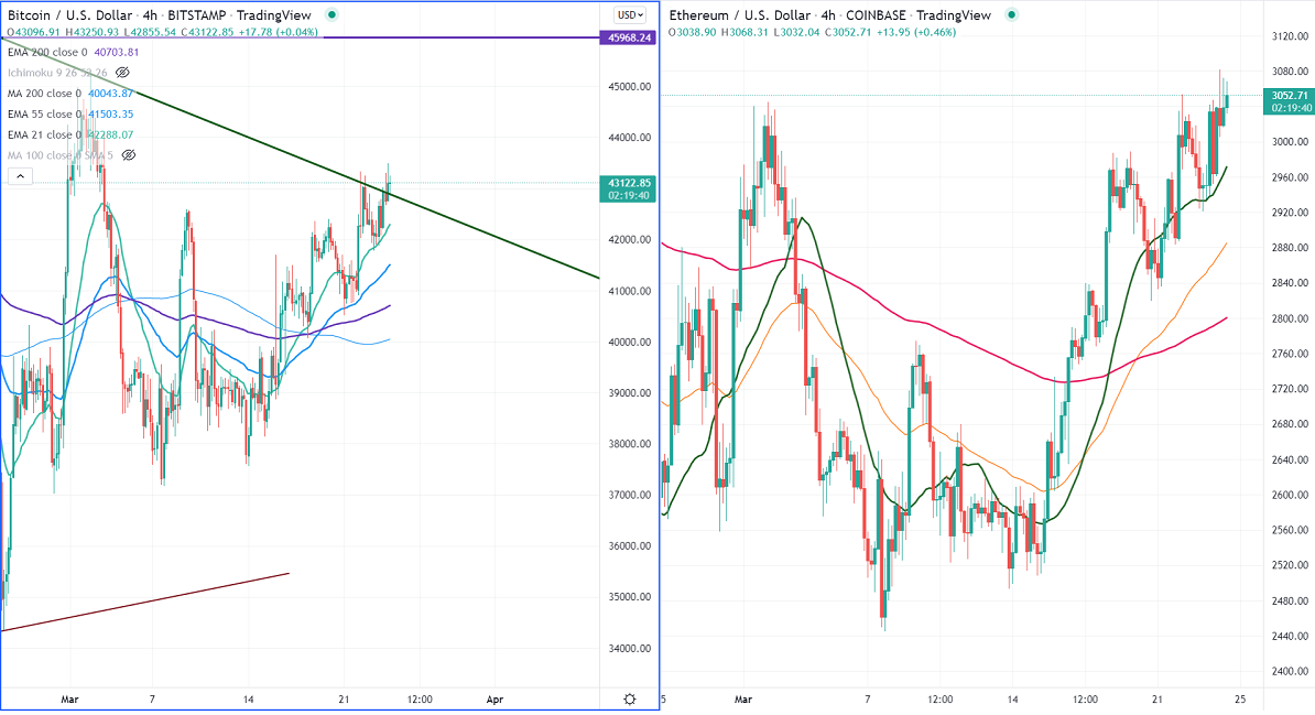 BTCUSD gained above $43000 following the footsteps of equity markets. The upbeat market sentiment is supporting Bitcoin at lower levels. Markets watching Russia and Ukraine war updates for further direction. The Russian invasion of Ukraine has increased the demand for cryptocurrencies. It hits an intraday high of $43492 and is currently trading around $43071.