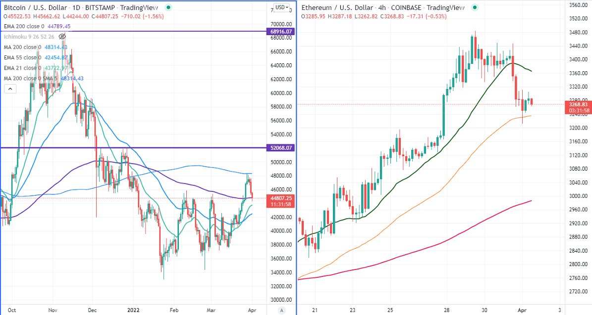 Levels to watch- $44000. Any daily close below $44780 confirms the bearish trend. A dip to $43500/$42500/$41700/$41000.Significant demand zones are around $37000-$34000. A breach below that level will pull the BTC to $30000/$24900.