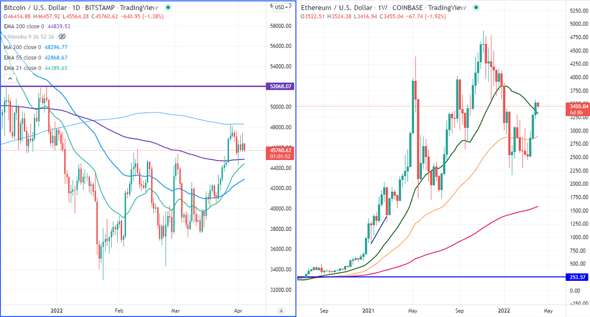 BTCUSD consolidates after hitting a low of $44234 Friday.BTC touched three-month amid the Russia-Ukraine war, and Fed policies. The decline in the US unemployment rate has increased the chance of the Fed's aggressive rate putting pressure on Bitcoin at a higher level. It hits an intraday low of $45564 and is currently trading around $45733.