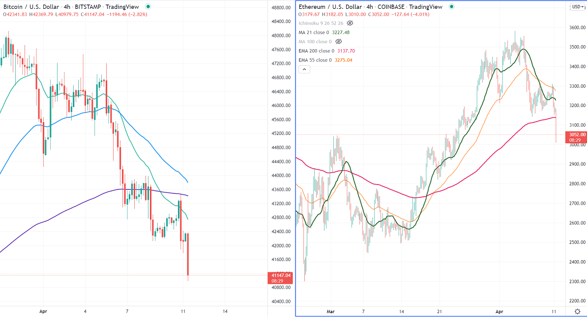 BTCUSD trades lower for seven consecutive days on risk aversion. The hopes of an aggressive rate hike are putting pressure on the pair at higher levels. It hits an intraday low of $40979 and is currently trading around $41219.