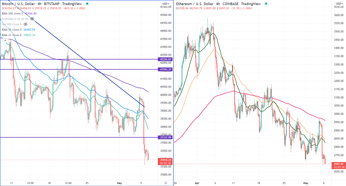 BTCUSD tumbled as decrease in demand for riskier assets. The crash comes after the Micro strategy CFO said that the company should add more collateral if BTC prices hit $21500. It hits a low of $35579 and is currently trading around $36120.