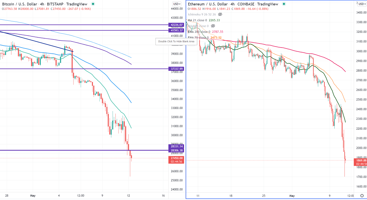 BTCUSD showed a massive sell-off yesterday and breaks significant support at $30000. The rise in inflation has forced major central banks to hike rates. The demand for riskier assets declines as market sentiment worsens. It hits a low of $25140 at the time of writing and is currently trading around $27605.