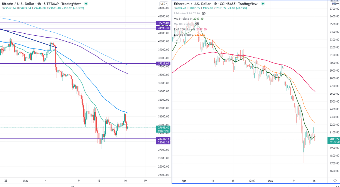 BTCUSD showed a minor pullback after El Salvador President announced that 32 central banks and 12 financial authorities from 44 countries to meet today to discuss BTC. The overall trend is still weak as long as the resistance of $48300 holds. It hits an intraday low of $29285 and is currently trading around $29600.