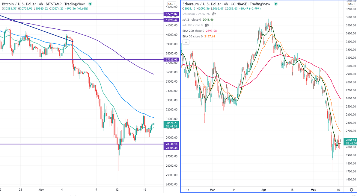 BTCUSD pared some of its gains made the previous week yesterday. It regained back above $30000 indicates that pair has formed temporary bottom around $25401.The risk aversion due to aggressive rate hikes by Fed prevents BTC from further upside. It hits an intraday high of $30783 and is currently trading around $30603.