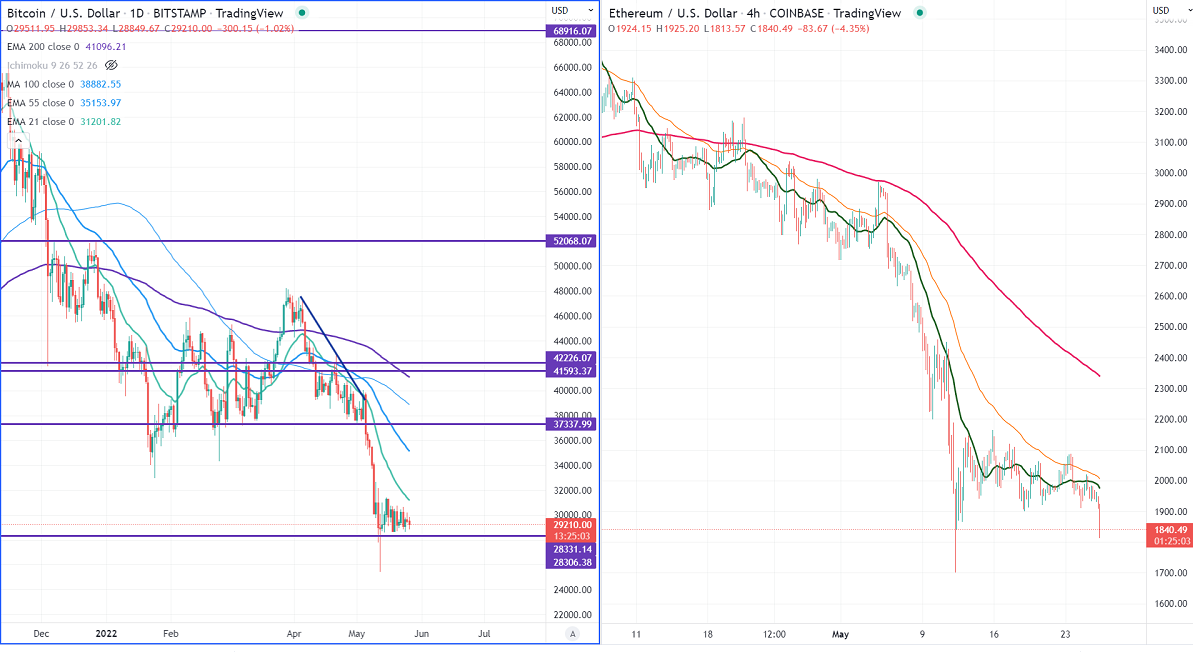 BTCUSD pared some of its gains made yesterday after hawkish Fed meeting minutes. The meeting confirms another two 50 bpbs rate hikes in June and July meetings. It hits an intraday high of $28870 and is currently trading around $29170.