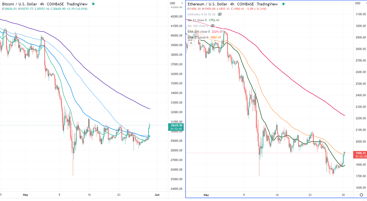 ETHUSD recovered more than $200, following in the footsteps of Bitcoin. It hits a high of $1913 at the time of writing and is currently trading around $1904.