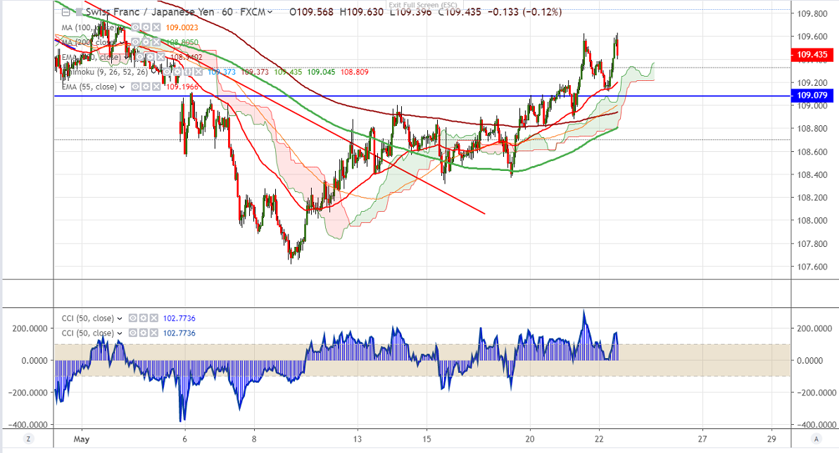 CHFJPY is consolidating after hitting high of 109.63 yesterday.The slight bullishness in Swiss franc is ongoing trade tension after US has planned to extend blacklist of Chinese companies.The pair declined till 109.11 and shown a minor recovery . In the past 1-month it was trading weak and lost nearly 400 pips from 111.97 high made on Apr 12th 2019. It hits intraday high of 109.63 and is currently trading around 109.41.