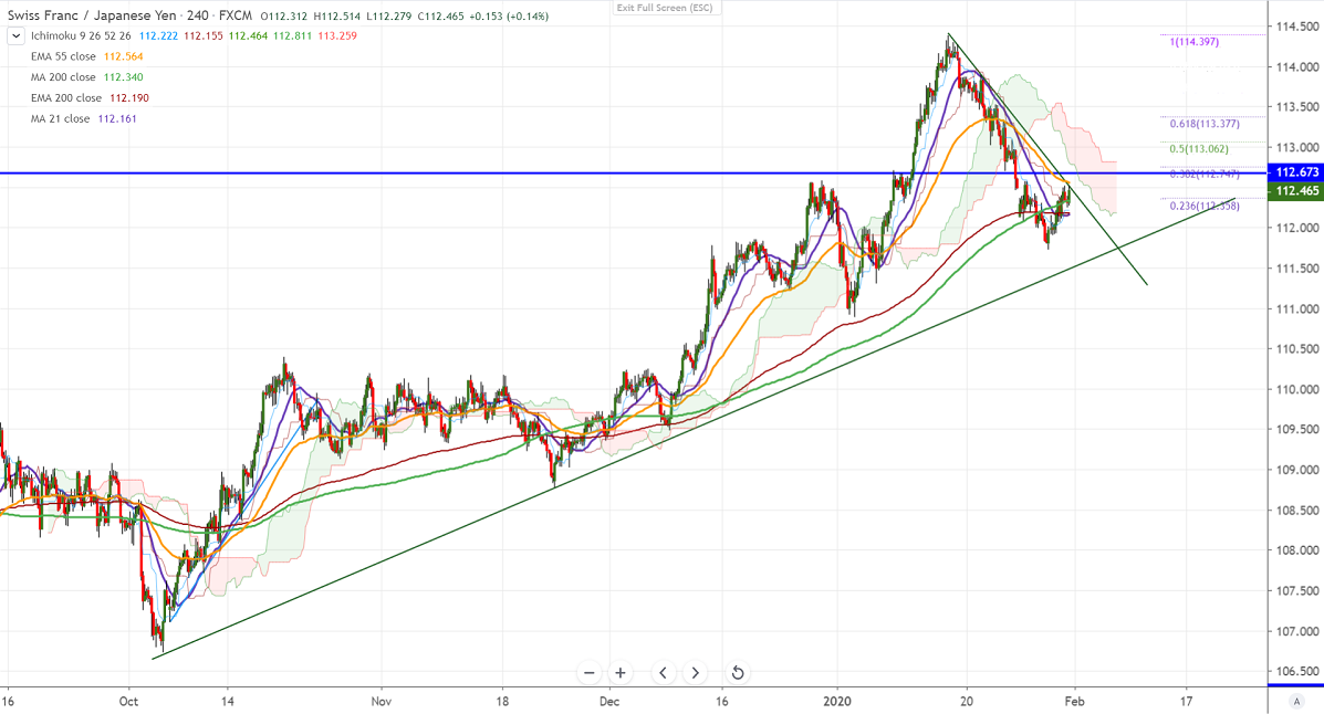 CHFJPY has halted its 2-weeks of bearishness and shown a minor jump of more than 70 pips on a slight jump in Swiss franc. The coronavirus has spread to 19 countries and almost 213 people died in China. The demand for riskier assets is getting declined. It hits an Intraday low of 112.508 and is currently trading around 112.501.