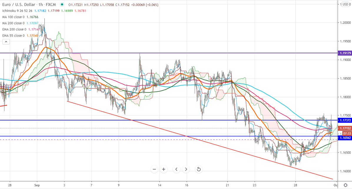 EURUSD jumped from a low of 1.16848 on US fresh stimulus hopes. US economy has added 749K jobs in Sep compared to a forecast of 650K. US pending sales rose 8.8% in August vs estimate of 3.1%. The pair surged till 1.17550 and is currently trading around 1.17138.