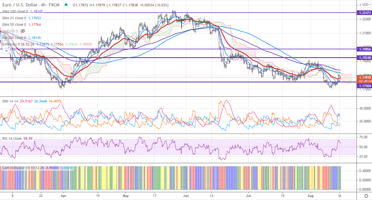 EURUSD recovered more than 40 pips after dismal US consumer confidence. The University of Michigan consumer sentiment declined sharply to 70.20 for Aug, the lowest level since 2011. The US 10-year yield lost more than 5% after the data. But weak Chinese data and the spread of the delta variant of the corona are putting pressure on Euro at higher levels. The pair hits an intraday low of 1.17863 and is currently trading around 1.17858.