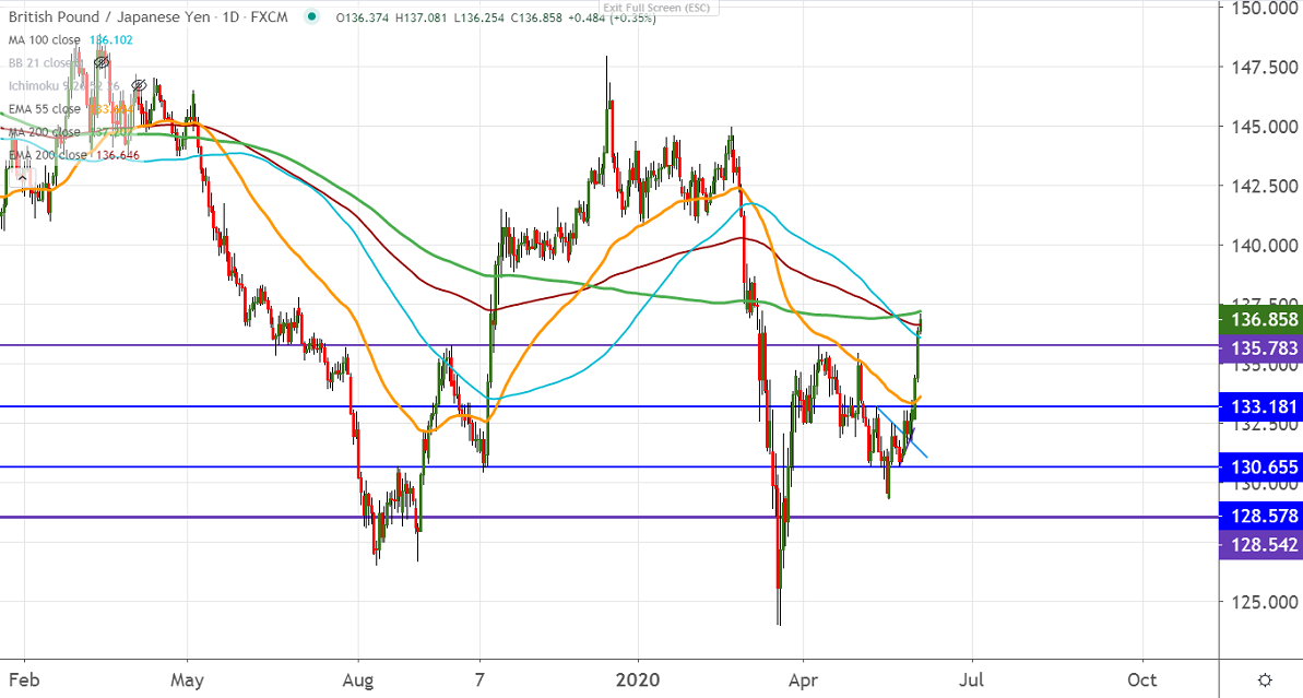 GBPJPY continues to trade higher for 4th consecutive days and shown a massive surge of more than 500 pips on weak yen. The pair has broken major resistance 135.75 Apr 9th, 2020 high) and jumped past 200- day EMA. It is currently trading around 136.88.