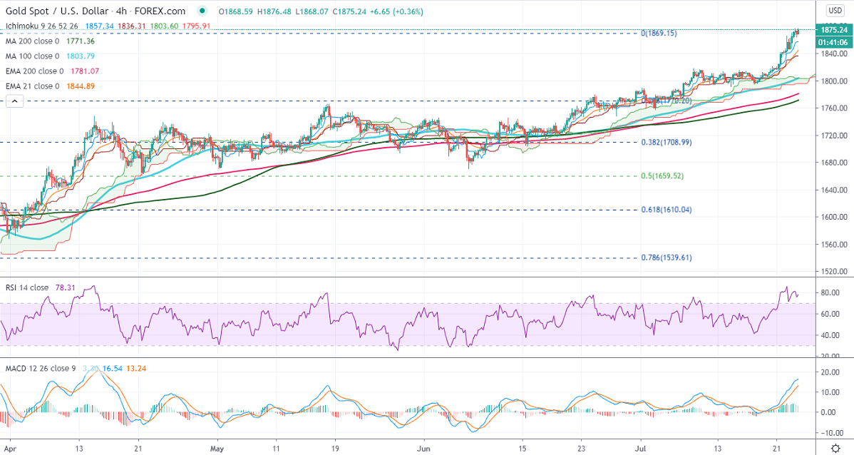 The yellow metal's near term resistance is around $1876, the violation above confirms bullish continuation. A jump till $1890/$1900 likely