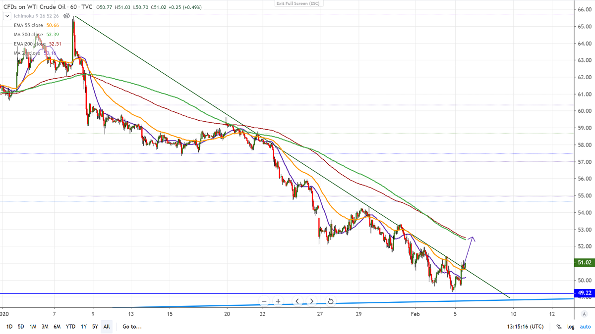 US oil has halted its one month of the bearish trend and shown a minor recovery. WTI declined more than 20% from highs of $62.79 on account of the outbreak of Coronavirus. Oil prices rose significantly after China announces the discovery of two drugs to treat Coronavirus. It hits high of $51.17 and is currently trading around $50.82.