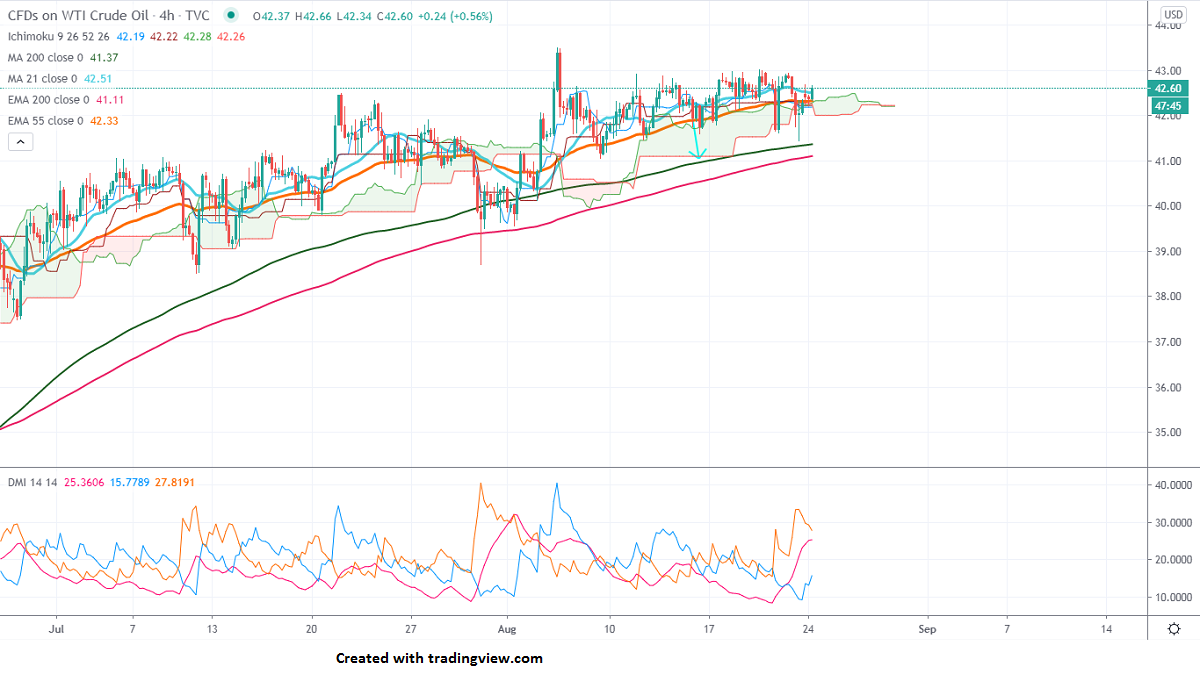WTI crude oil has recovered sharply more than $2 from low of $41.44 on Gulf storms. The hurricane Marco and Laura are expected to hit the Gulf of Mexico by this week. Almost 57% of energy firms shut offshore oil and gas production. The slight pessimism in the recovery of the global economy after COVID-19 and US, China trade war is putting pressure on oil at higher levels.