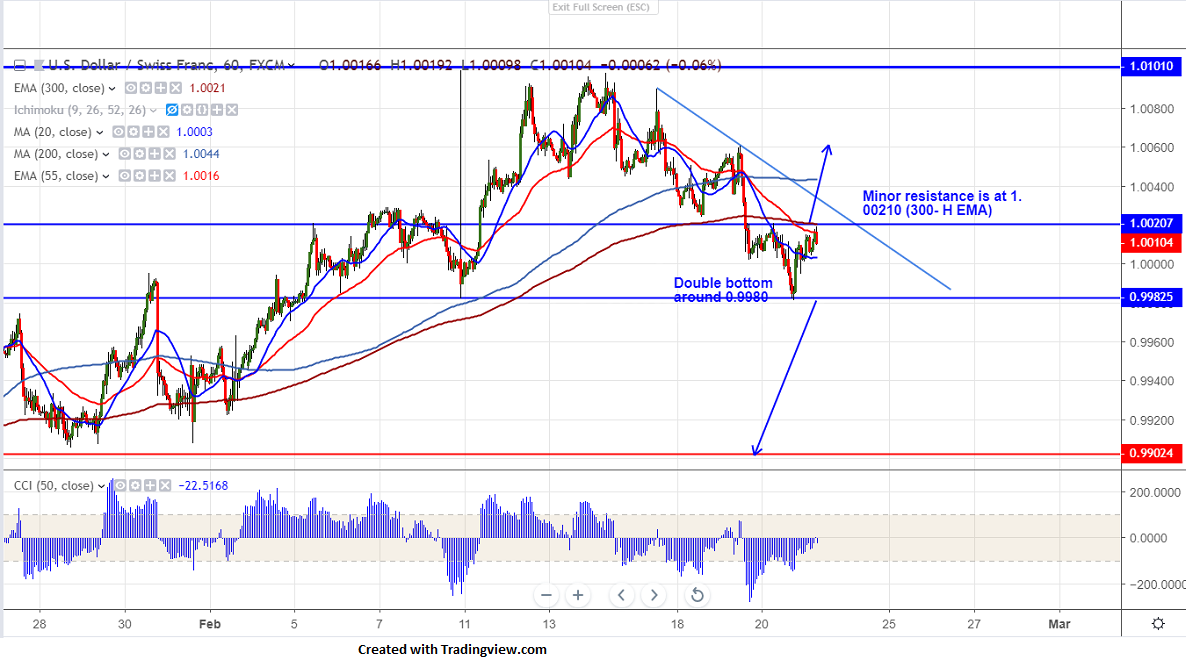 The pair has recovered till 1.00208 and is consolidating around that level. Any convincing break above 1.00210 (300- H EMA) confirms intraday bullishness and a jump till 1.0050/1.0100 is possible.Any break above 1.01285 confirms that it has formed bottom around 0.97160.