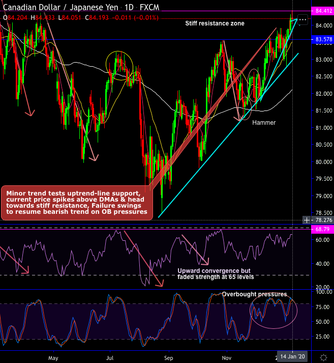 CADJPY major trend has been sliding through downtrend line (weekly chart) and minor trend is spiking with uptrend line (refer daily chart). Bulls have tested uptrend line support with hammer and bullish engulfing patterns, consequently, bounced back above 7 & 21-DMAs with bullish crossovers in the minor trend of this pair.
