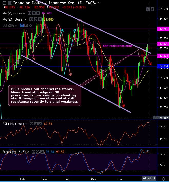 We had advocated tunnel options strategy for CADJPY couple of days ago (05th July to be precise) as it showed failure swings at channel resistance in the recent past as you could make out in the daily plotting, but for now, it has broken-out the channel resistance.