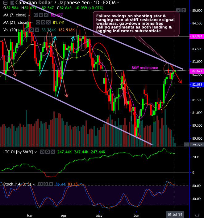 Consequently, the current price slid way below 7DMAs at recent lows of 82.029 levels, although the mild rallies are observed but likely to be restrained at stiff resistance of 82.624 levels (refer daily chart).