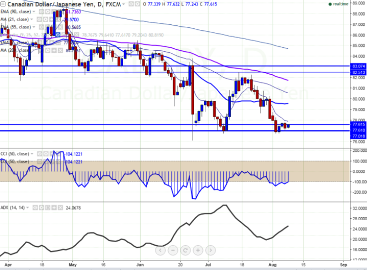 - The pair is consolidating in a narrow range between 76.98 and 77.56 for the past two trading session. It is currently trading around 77.49.