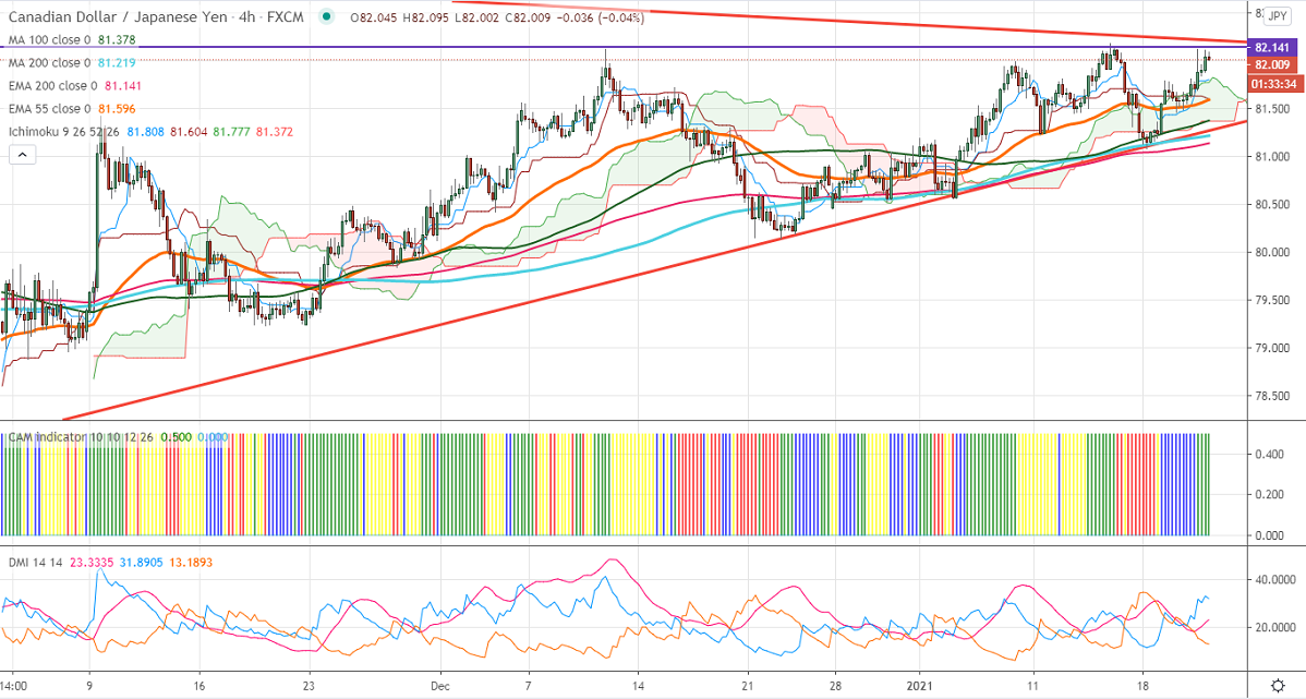 CADJPY is trading higher for 2nd consecutive days on a strong Canadian dollar. It has kept its rates unchanged and promised to keep on hold until the inflation target reaches. Canadian CPI slows down to -0.2% compared to a forecast of 0.1%. USDCAD hits a 33-month low after BOC monetary policy. Short term trend of CADJPY is bullish as long as support 81 holds.