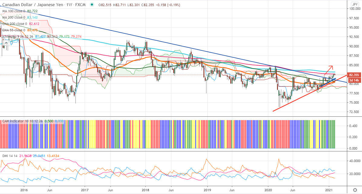 CADJPY has halted its seven-week of bullish trend and shown a minor decline on the strong yen. The Canadian dollar was one of the best performers in the past eleven months and surged more than 14% against the US dollar. The broad-based US dollar selling and jump in crude oil prices is supporting the Canadian dollar. Brent crude oil prices are trading above $60 after the Coronavirus pandemic. The decline in coronavirus cases and vaccination has increased hopes of oil demand. The short term trend of CADJPY is bullish as long as support 81.80 holds.